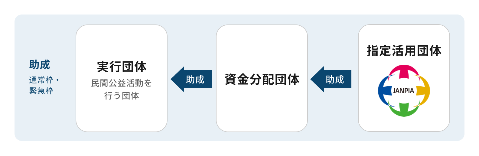 JANPIAは資金分配団体を、資金分配団体は実行団体を、それぞれ公募により選定しています。