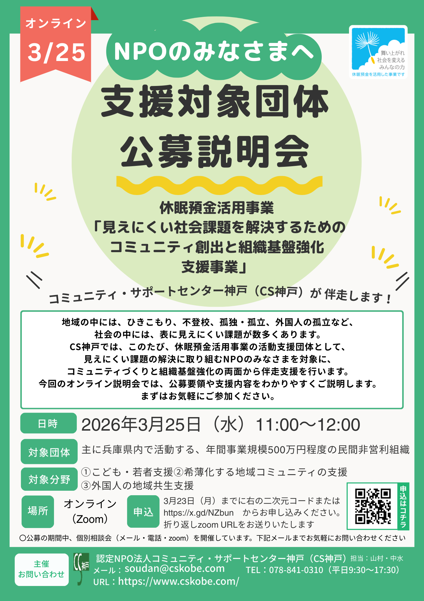 CS神戸では、このたび、休眠預金活用事業の活動支援団体として、