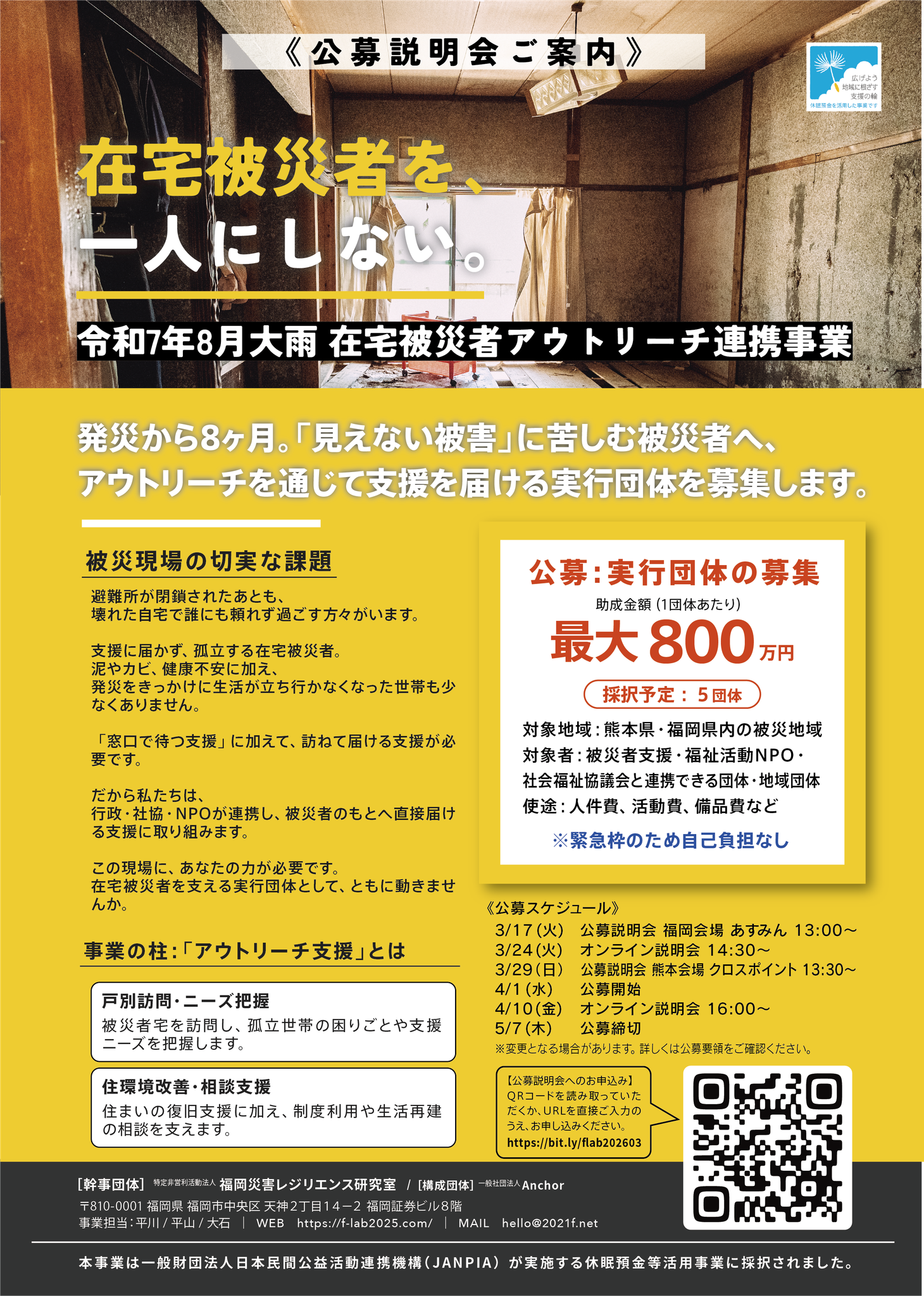 令和7年8月の大雨により、熊本県および福岡県内の一部市町で住宅被害や生活基盤の損失が発生しました。発災当時から支援につながらないまま、潜在的なニーズを抱えている方がいる可能性も指摘されています。時間の経過とともに課題が見えにくくなる中、在宅被災者の孤立や生活不安への対応が求められています。本事業は、こうした支援の空白を埋めることを目的に、地域に根ざした団体によるアウトリーチ活動を推進するものです。分配団体として実行団体を公募し、資金面および伴走支援を通じて地域課題の解決を図ります。