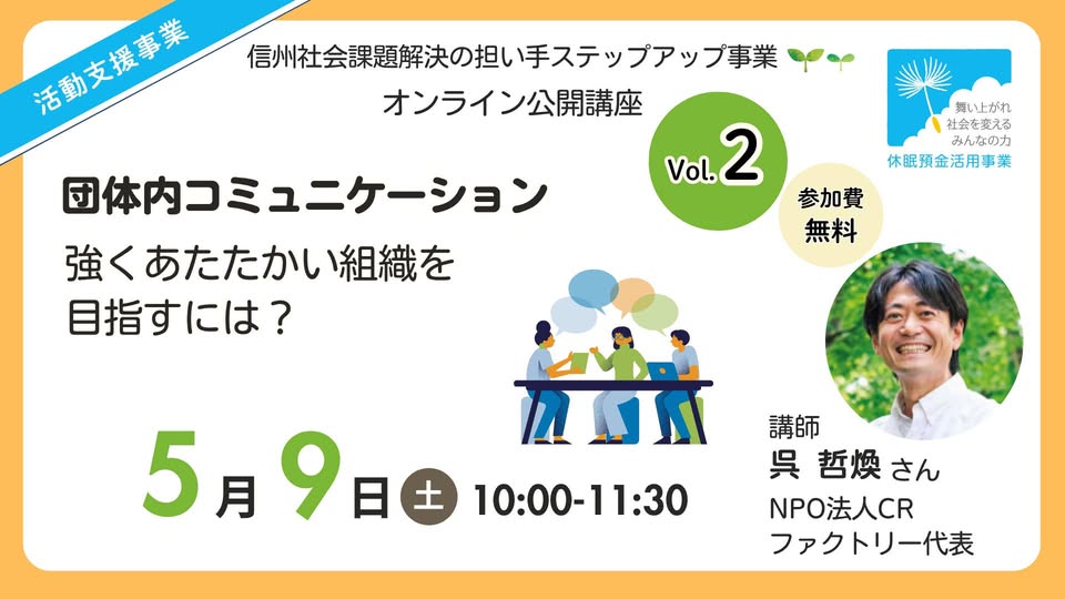 この講座は、長野県内で社会課題解決に取り組む担い手の組織基盤の強化を図り、成長を応援することを目的とし、休眠預金活用事業の活動支援事業「信州社会課題解決の担い手ステップアップ事業」の一環として実施します。