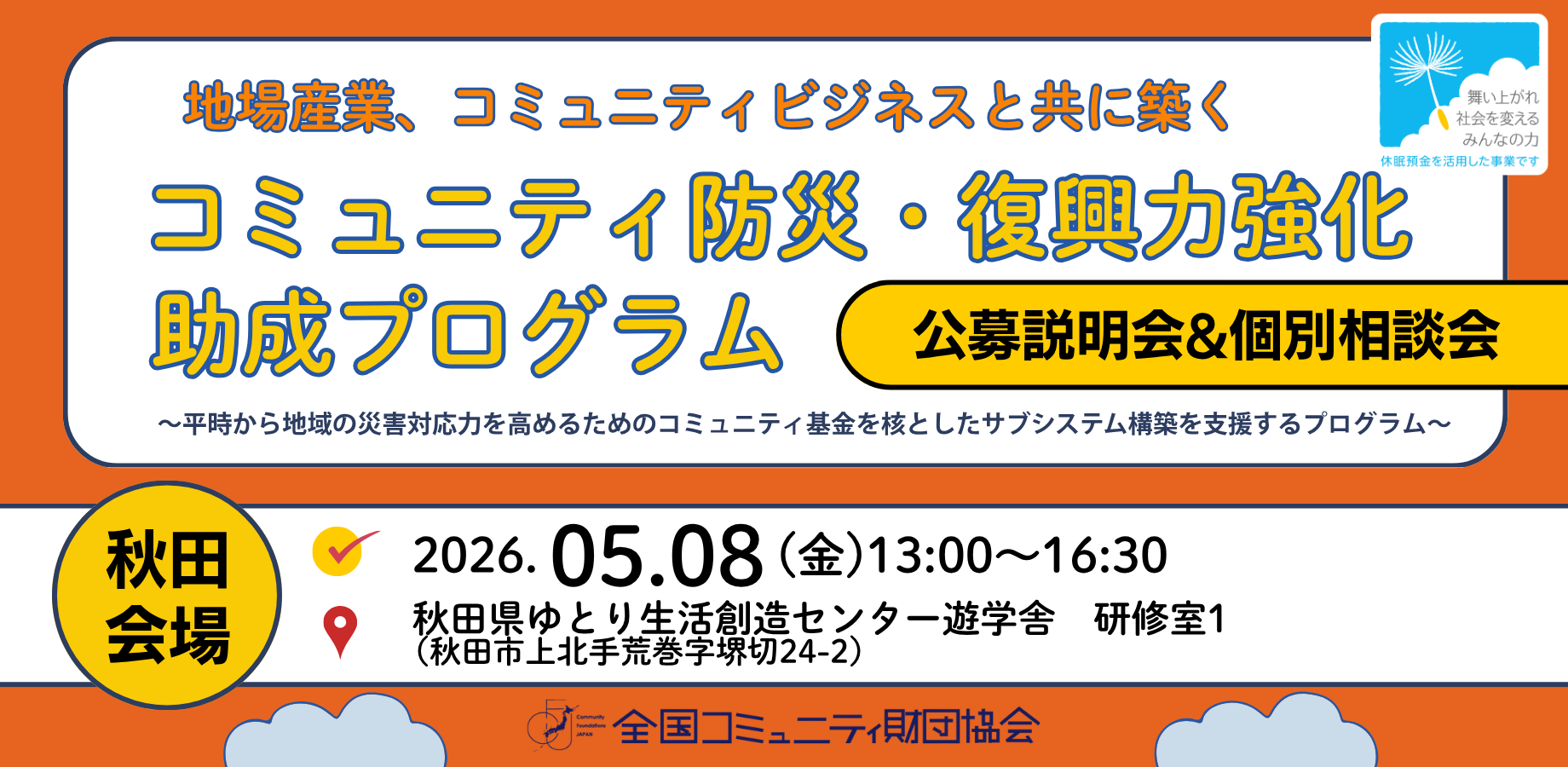 全国コミュニティ財団協会では、休眠預金活用事業として、平時から地域の災害対応力を高める取り組みを、コミュニティ基金を通じて支援する「地場産業、コミュニティビジネスと共に築く コミュニティ防災・復興力強化助成プログラム」を公募中です。
