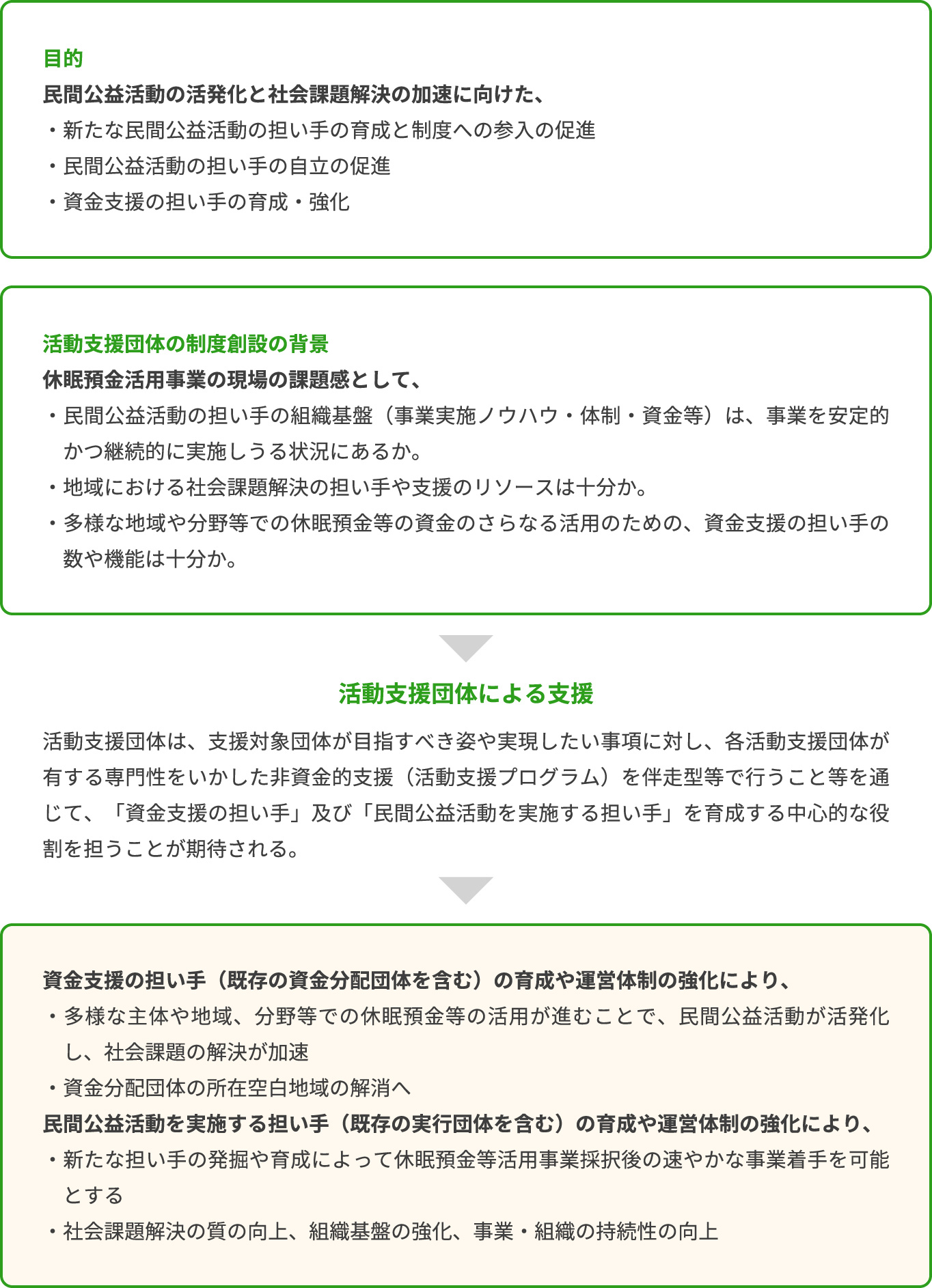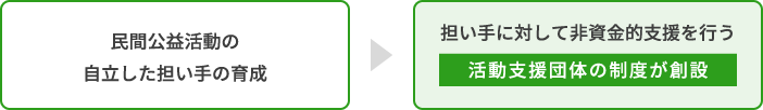 2019年度から休眠預金等を活用した助成事業を実施する中で民間公益活動の担い手における組織基盤等が、当初の想定していたよりも弱いことがわかってきました。また、助成による資金支援と併せて、担い手に寄り添いながら非資金的支援を実施することが、特に草創期の活動支援に効果的であり、その後の自立につながることが明らかとなりました。 今後、民間公益活動の自立した担い手をより多く育成するため、これまで資金分配団体の役割の中で付随的業務として行われていた伴走支援を体系化・制度化し、それを通じたソーシャルセクターの担い手の一層の育成を図っていく必要があります。 こうした課題を踏まえ、法施行後5年を目途とする見直...