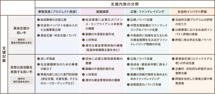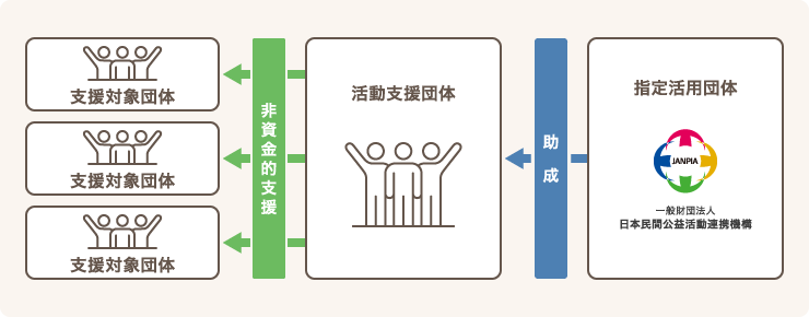 JANPIAから助成を受けた活動支援団体が、「活動支援プログラム」を企画・設計し、伴走型等による非資金的支援を提供することで、社会課題の解決に取り組む自立した担い手の育成を図る制度です。