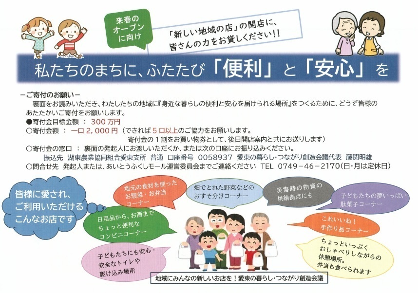 危機感を覚えたあいとうふくしモール内の3事業所代表が発起人となり周囲に協力を呼びかけたところ、愛東地区まちづくり協議会や自治会の関係者、商工業者らが集合。スーパーが閉店する1ヶ月前から議論を始め、地域の課題を整理し始めました。