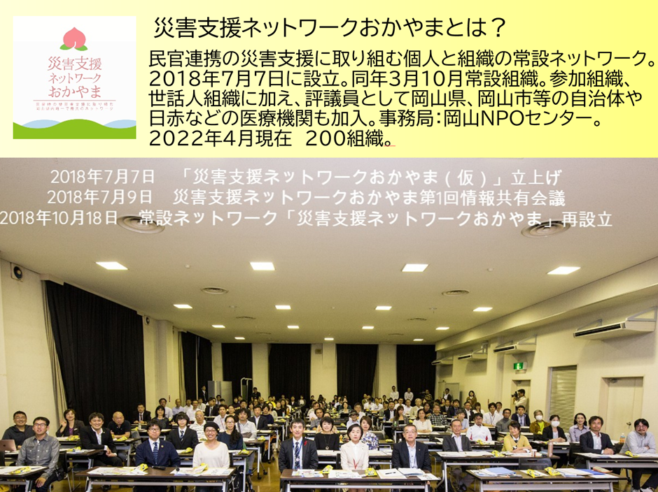 三者連携が進んできたとはいえ、組織文化か進め方も異なるためにまだまだ難しい行政機関と民間との災害支援に関する連携。災害支援ネットワークおかやまは平時の備えからの関係性の構築や継続を目指しています。