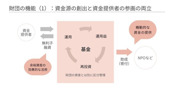 財団では、資金提供者からお金を預かり、社会的活動をリードする企業の株式や債券として運用。その運用益がNPOや当事者を支援する原資となります。「寄付」のように一定期間で使い切るのではなく、長期的な支援が可能になります。また、最終的に資金提供者に元本を返す仕組み(※) によって、資金提供に対するハードルを下げています。