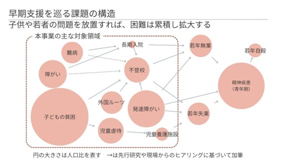 加藤「ヒアリングを行い、考えていく中で、今回の事業のターゲットとなる領域や課題の構造が明確になりました。日本の支援制度自体は充実しているのですが、領域ごとに縦割りで、支援が分断されていることも多いものです。例えば、子どもが医療的な課題を抱えている場合、病院では診断や治療を受けることができます。でもその子が学校に戻ったとき、教育の現場ではその情報が共有されていなかったり、支援につながらなかったりすることがあります。反対に、学校にいる子どもたちの中にも、医療的なリスクを抱えているのに、それが診断されずに放置されているケースもあります」