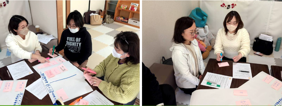 ワークショップでは、組織課題を洗い出し、ファミリーステーションRinが大切にしている価値観の言語化、スタッフ一人ひとりの成長ステップを明確にするキャリアプラン表の作成、事業承継後を見据えた3年後の理想的な組織像の策定などが行われました。