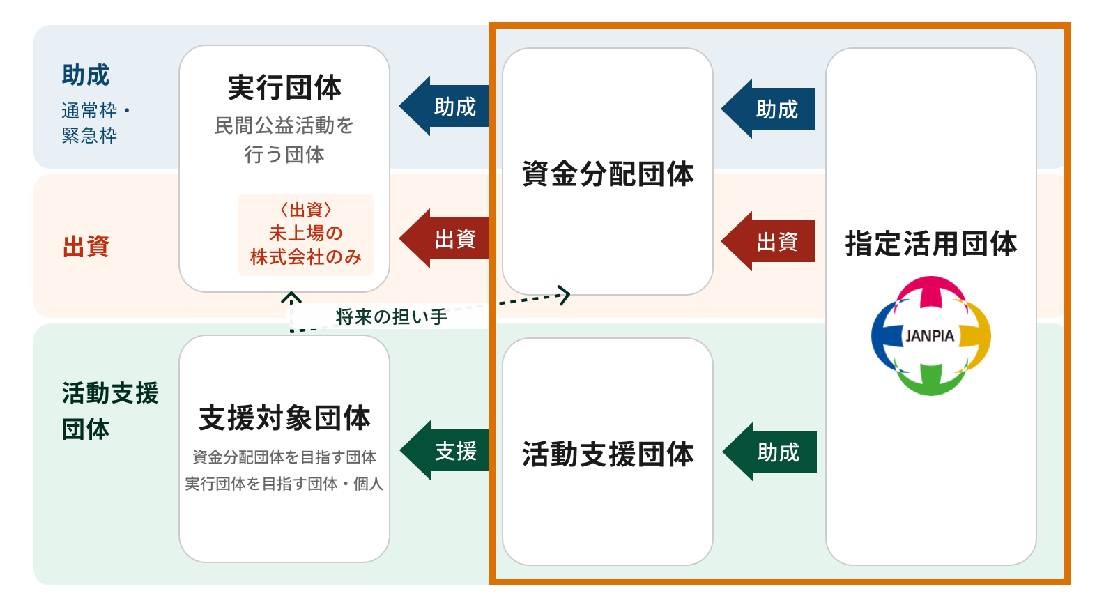 「資金分配団体」と「活動支援団体」は、JANPIAが公募します。